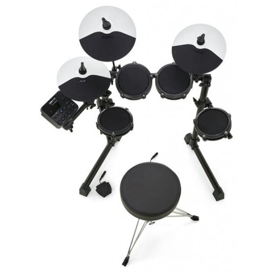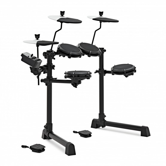 Set de batería digital para principiantes compuesta por un módulo de sonidos con 10 kits y 120 sonidos, 4 pads con parches de malla, 3 pads de plato y pedales para bombo y hi-hat. Incluye asiento, baquetas y auriculares.