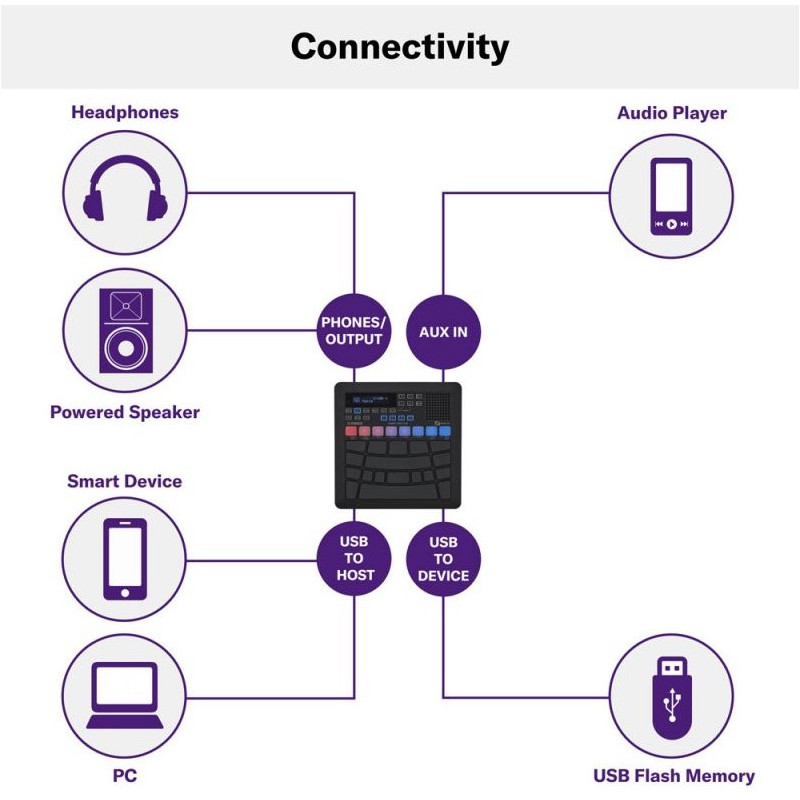 • Conexiones: Salida de línea/auriculares mini-jack estéreo, entrada auxiliar, USB to device y USB to host