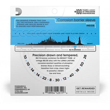 Juego de Cuerdas para Guitarra Acústica de 12 cuerdas D'Addario EZ940 85/15 Bronze, 12-String Acoustic Guitar, Light - Calibre 10-47. Fabricadas en aleación de bronce. Tono lleno y brillante. Calibres: .010, .010, .014, .014, .008, .022w, .012, .030w, .018, .040w, .026w, .050w. Fabricadas en EEUU.