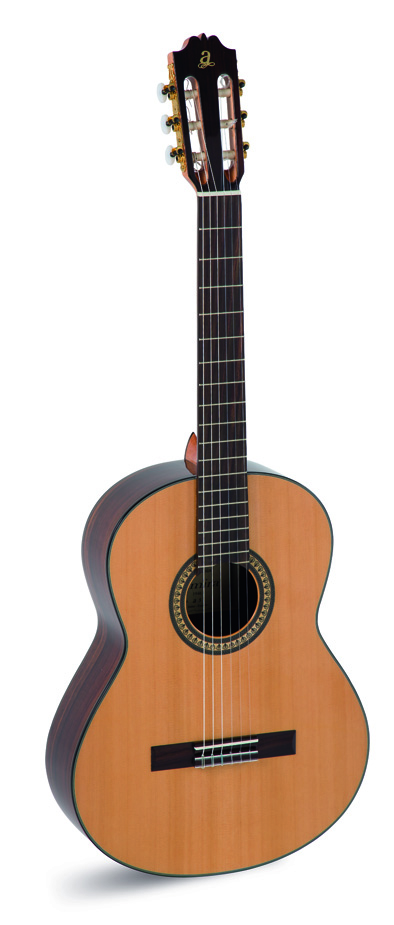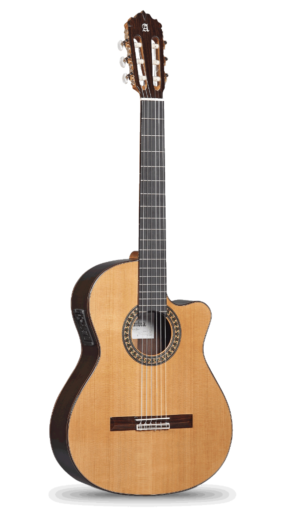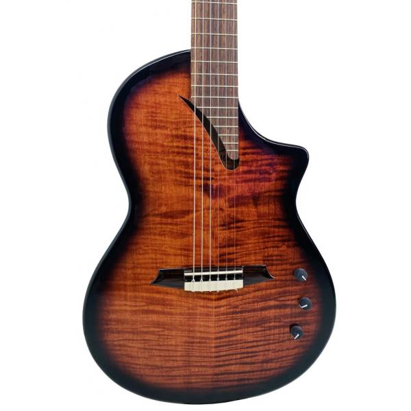 Guitarra Martínez Hispania Red Cognac. Fabricada completamente con arce macizo de alta calidad. Cuenta con un sistema de electrificación con efectos de Reverb y Delay, que produce un sonido cálido y muy versátil.