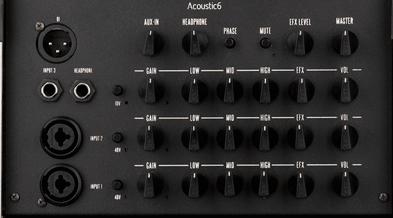El Acoustic 6 es un combo de 120 vatios con woofer de 6'' y 3 entradas independientes. Canales 1 y 2 con entrada Combo XLR+Jack y alimentación phantom de 48V. Canal 3 con Jack y alimentación phantom de 10V. Todos los canales están equipados con ganancia, volumen, ecualizador de 3 bandas y volumen de efectos independientes.