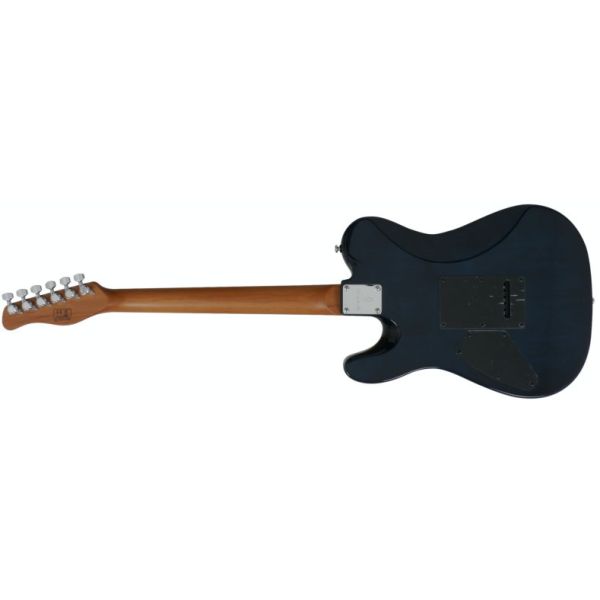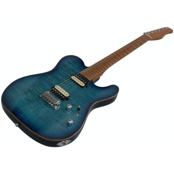 Guitarra eléctrica Larry Carlton T7 FM TBL Trans Blue - Cuerpo de aliso de norteamérica con veneer flameado en acabado Trans Blue. Mástil de arce duro tostado con forma C y escala 25,5". Diapasón de arce duro tostado (Rolled Edges) con radio 9,5" y 22 trastes Medium Jumbo. Cejuela de hueso (42 mm). Pastillas Sire LC super-M Pickup Set (Zebra). Controles de Volumen y Tono. Selector de 5 posiciones. Puente T7 2-post Modern Bridge (Bloque de acero y selletas de acero inoxidable). Clavijas de bloqueo. Herrajes cromados.