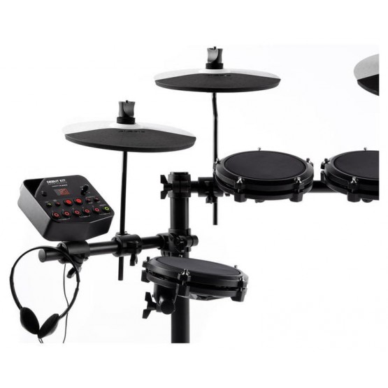 Set de batería digital para principiantes compuesta por un módulo de sonidos con 10 kits y 120 sonidos, 4 pads con parches de malla, 3 pads de plato y pedales para bombo y hi-hat. Incluye asiento, baquetas y auriculares.