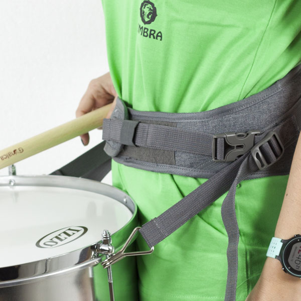 Correas de nylon acolchadas batucada. Con cierre de seguridad y cierre velcro. Dos mosquetónes metálicos y correderas. Largo cintura: mínimo 103cm-máximo 120cm. Para timbas, surdos, repeniques, tambores, etc