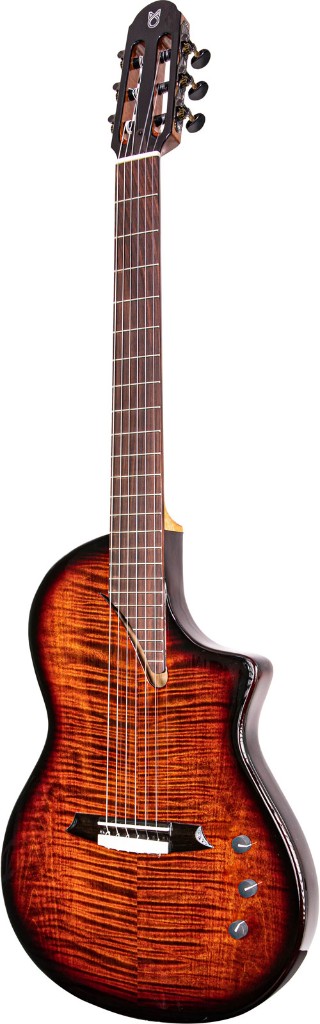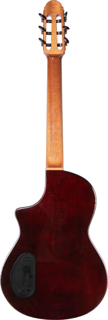 Guitarra Martínez Hispania Red Cognac. Fabricada completamente con arce macizo de alta calidad. Cuenta con un sistema de electrificación con efectos de Reverb y Delay, que produce un sonido cálido y muy versátil.