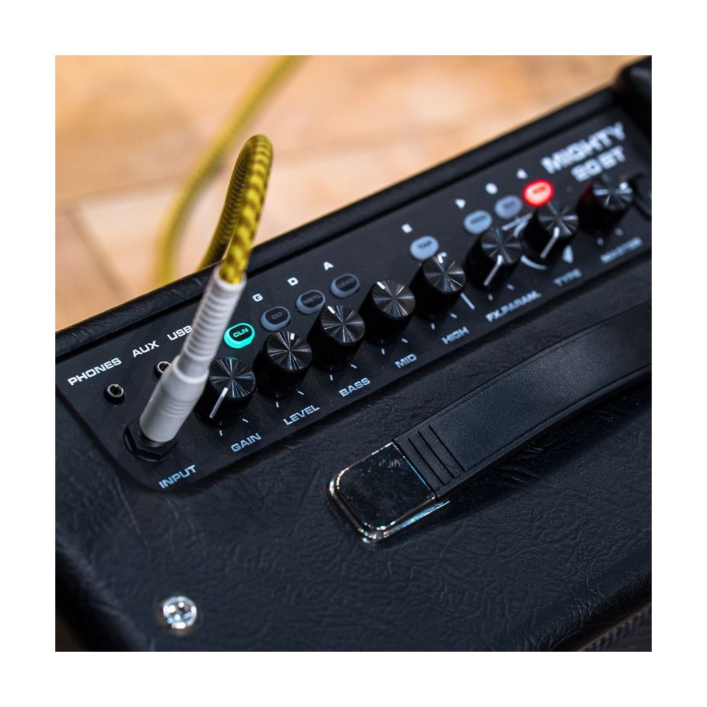 Mighty 20 BT es el amplificador perfecto para casa. Te permite copiar el sonido de otros amplificadores dentro de un sólo conjunto y también ofrece algunos efectos que van integrados. Suena suficientemente alto como para revolucionar tus fiestas o mantenlo en silencio para practica. Mighty 20 BT tiene 4 canales y cada canal tiene 2 sonidos pregrabados, y cada preajuste ofrece un sonido característico de amplificador- En resumen,tendrás 8 amplificadores. Puedes tener el sabor real de diferentes músicas y tocar diferentes estilos. Mighty 20 BT te permite usar y combinar 3 efectos a la vez. Puedes vincular modos effect, delay, y reverb a la misma vez y hacer un experimento en tu sonido con los sonidos digitales de alta calidad. 20 BT tiene 3 tipos de efectos de modulación, 3 tipos de efectos reverb y delay. El amplificador operacional NUX Mighty 20 BT Digital también se caracteriza por tener un tuner preciso y un equalizador de 3 bandas. El amplificador tiene una salida de auriculares y una entrada auxiliar. Esto te permite practicar con cualquier reproductor de música (o teléfono móvil) y también para practicar en silencio. Puedes conectar cualquier dispositivo Bluetooth y tocar tu música favorita practicando o ensayando. Puedes controlar el amplificador Mighty 20 BT con una aplicación móvil, como función adicional, un Noise Gate viene con la app. Todos los parámetros y TAP TEMPO se pueden controlar con la app, incluso el cambio de canal.