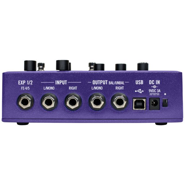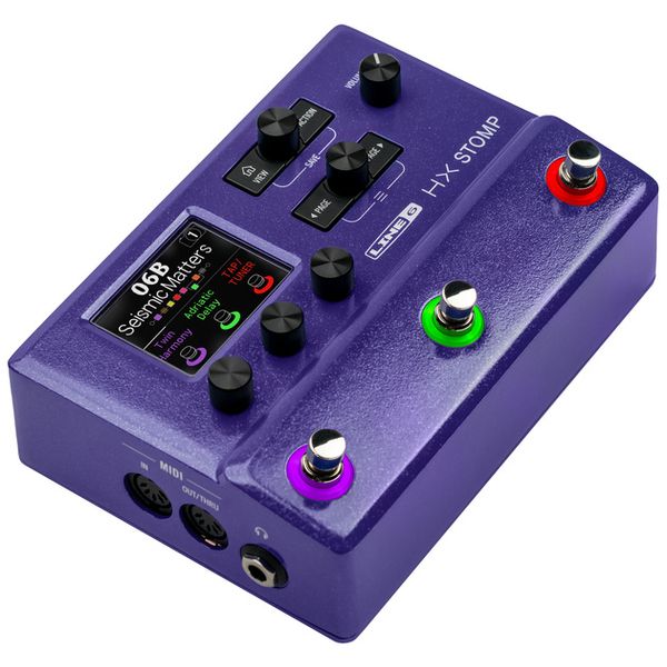 Line 6 HX stomp, multi-effects pedal, multi-effects processor with helix sound, color LCD display, integrated audio interface, over 300 effects and models from the Helix, M series and other Line6 products, 6 simultaneously usable amplifiers, boxes and effect blocks (including Looper and IR Loading), 3 footswitches with color-coded LED rings, Midi In and Out, expression pedal connector, input L / Mono, Right, output L / Mono and Right, USB, Midi In and Out / Thru, Headphone Output, FX Loop, Aux In, dimensions 7.01" x 4.96" x 2.6", weight 1,75 lbs, power supply connector 9V DC 3A, incl. power supply.