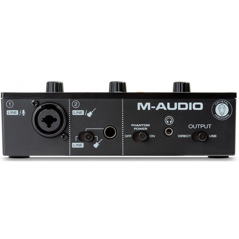 La M-Track Solo ofrece un señal de monitoreo sin latencias a través de su salida RCA y de 1⁄8 pulgadas. El interruptor USB/Direct ajusta el balance entre las entradas y el playback del ordenador, facilitando la grabación de partes nuevas en una composición.