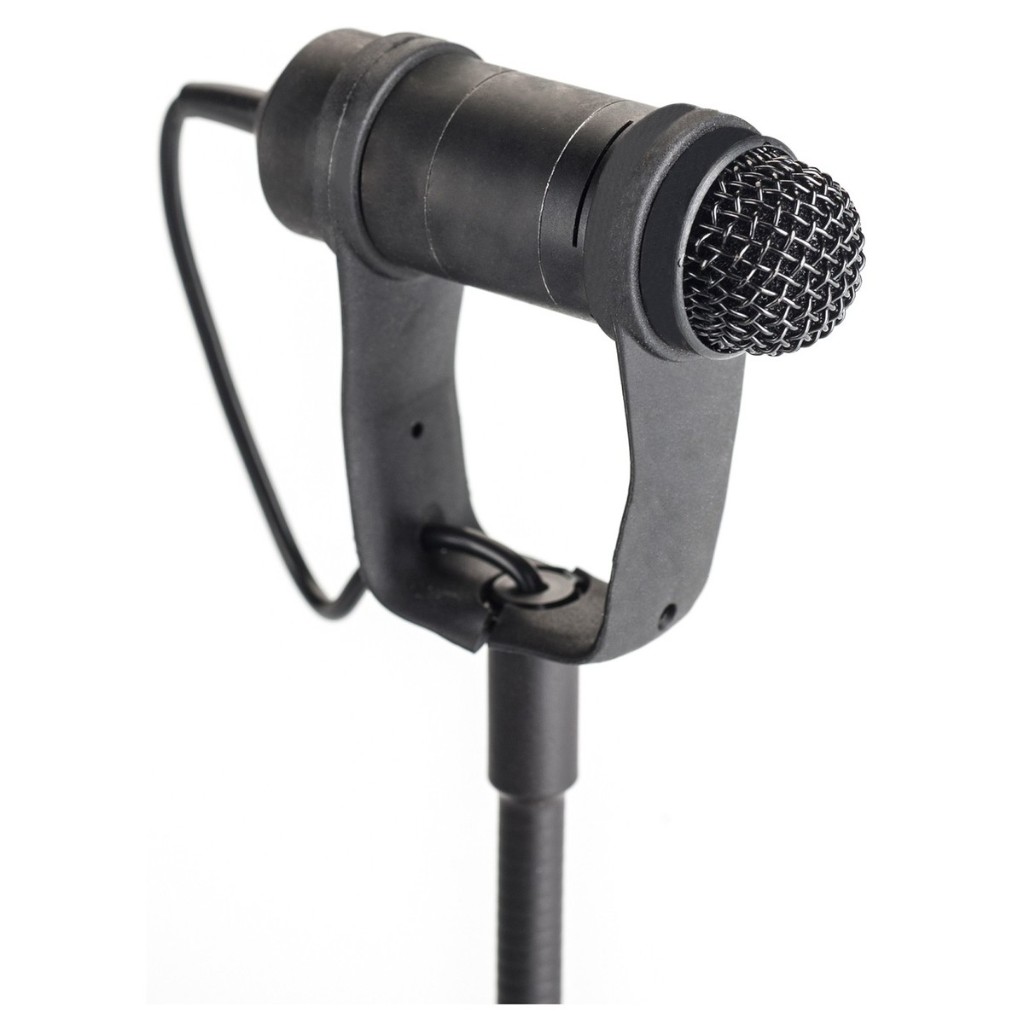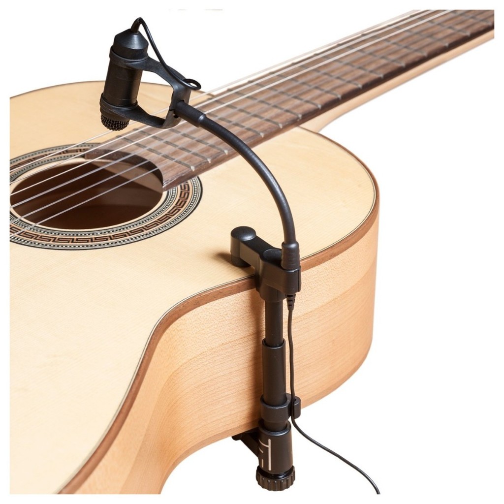 Micrófono de pinza para captar guitarras y especialmente indicado para actuaciones en directo en el escenario. El micrófono de condensador se fija simplemente al cuerpo del instrumento con un clip. El cuello de cisne ajustable puede ser movido a la posición deseada, permitiendo la orientación ideal del micrófono.