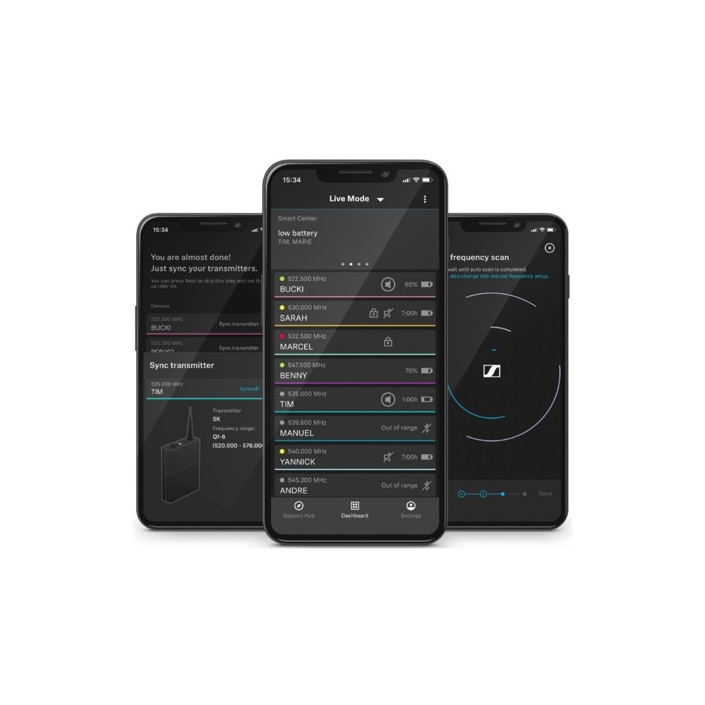 Sistema digital para cantantes o presentadores (banda Q1-6 470,2-526MHz). Compuesto por un emisor de mano SKM-S de 100mW con switch, mute, capsula MMD835-I dinámica cardioide desmontable (puede usarse con batería recargable BA70 NO incluida) y un receptor enracable EW-D EM diversity con 2 antenas externas, 90 canales con un ancho de banda de 56MHz, pantalla led con telemedida del estado de las pilas, autotune para busqueda automática de canal con sincronización automática del emisor, output con XLR y JACK. Pueden funcionar hasta 20 equipos simultaneamente. Incluye accesorio de rack GA3, pinza para micrófono MZQ1, alimentador NT12-5 y 2 pilas AA. control por app Bluetooth.